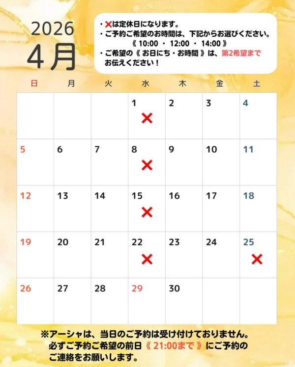 4月のご予約可能日をお知らせいたしますので、ご確認のうえご予約をお待ちしております。